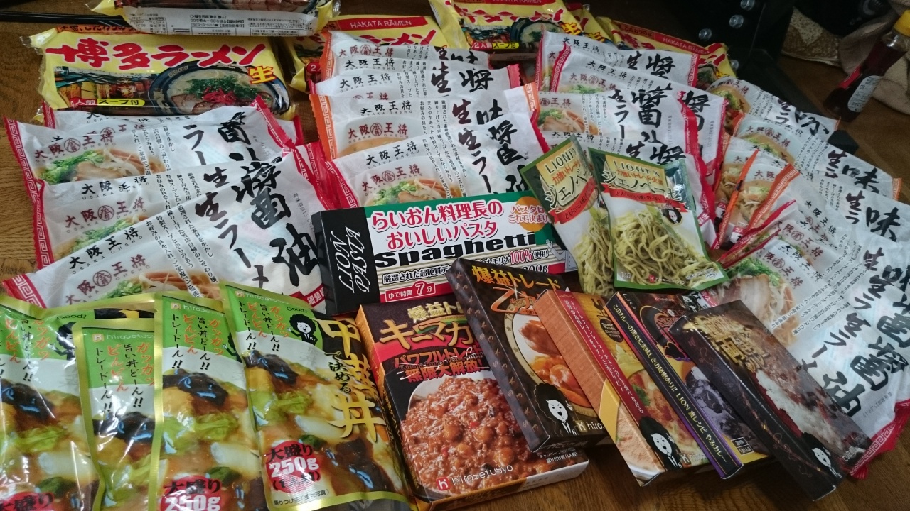 ラーメンは1袋2食。食品全部あわせたら80食くらいある。